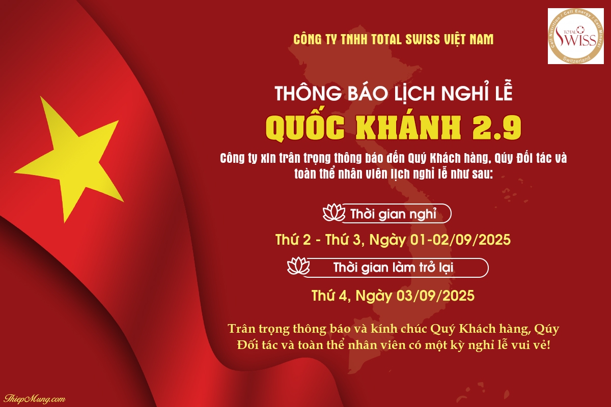 Công ty TNHH Total Swiss Việt Nam xin trân trọng thông báo đến Quý Khách hàng, Quý Đối tác và toàn thể nhân viên về lịch nghỉ lễ Quốc Khánh 02/09 như sau: